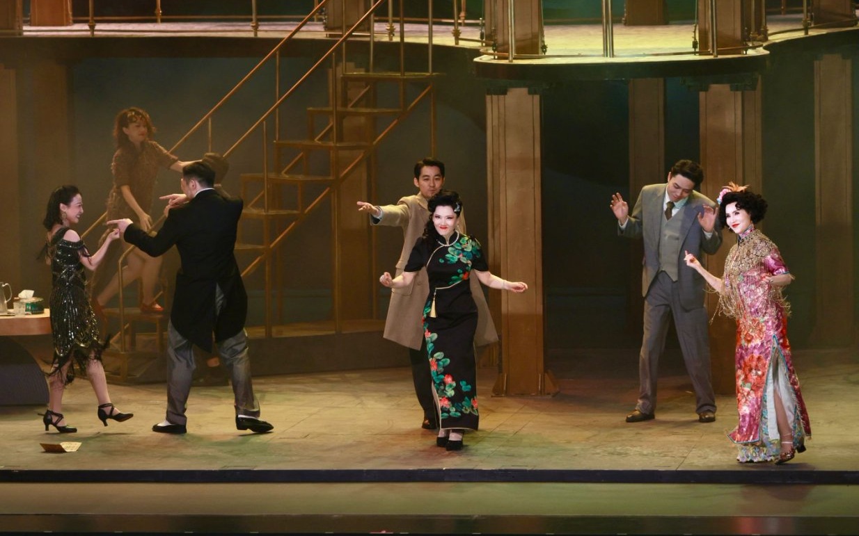 陈白露的饰演者何赛飞在谢幕时舞蹈(中)。